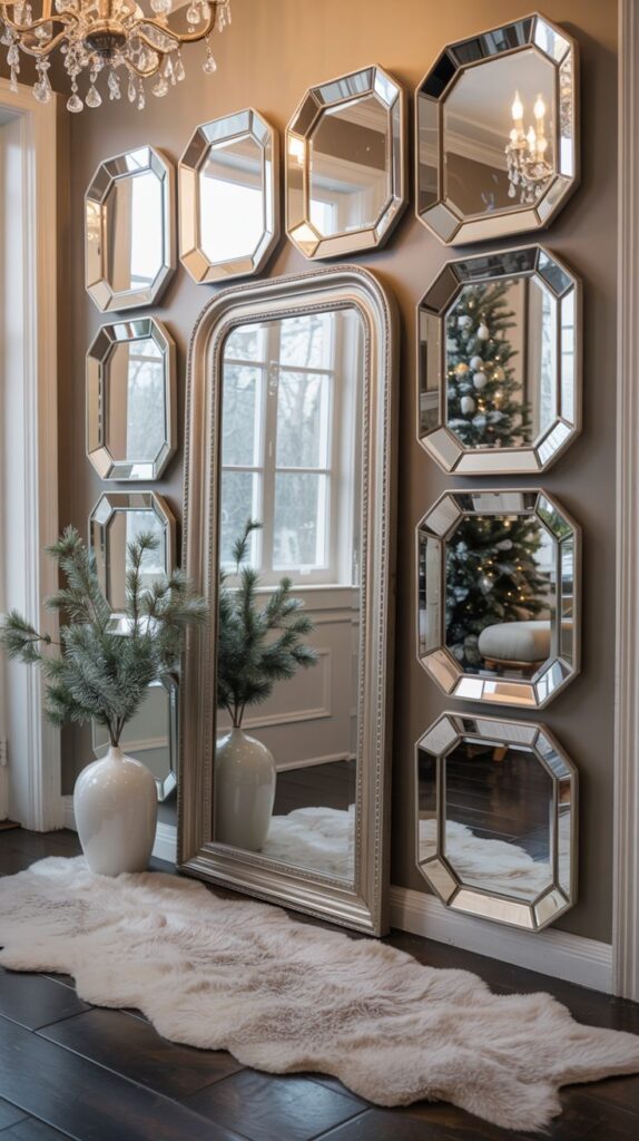 Place mirrors opposite windows to reflect natural light or behind lamps to enhance brightness. Decorative mirror arrangements can also act as wall art. This budget-friendly idea improves both style and functionality without heavy spending.